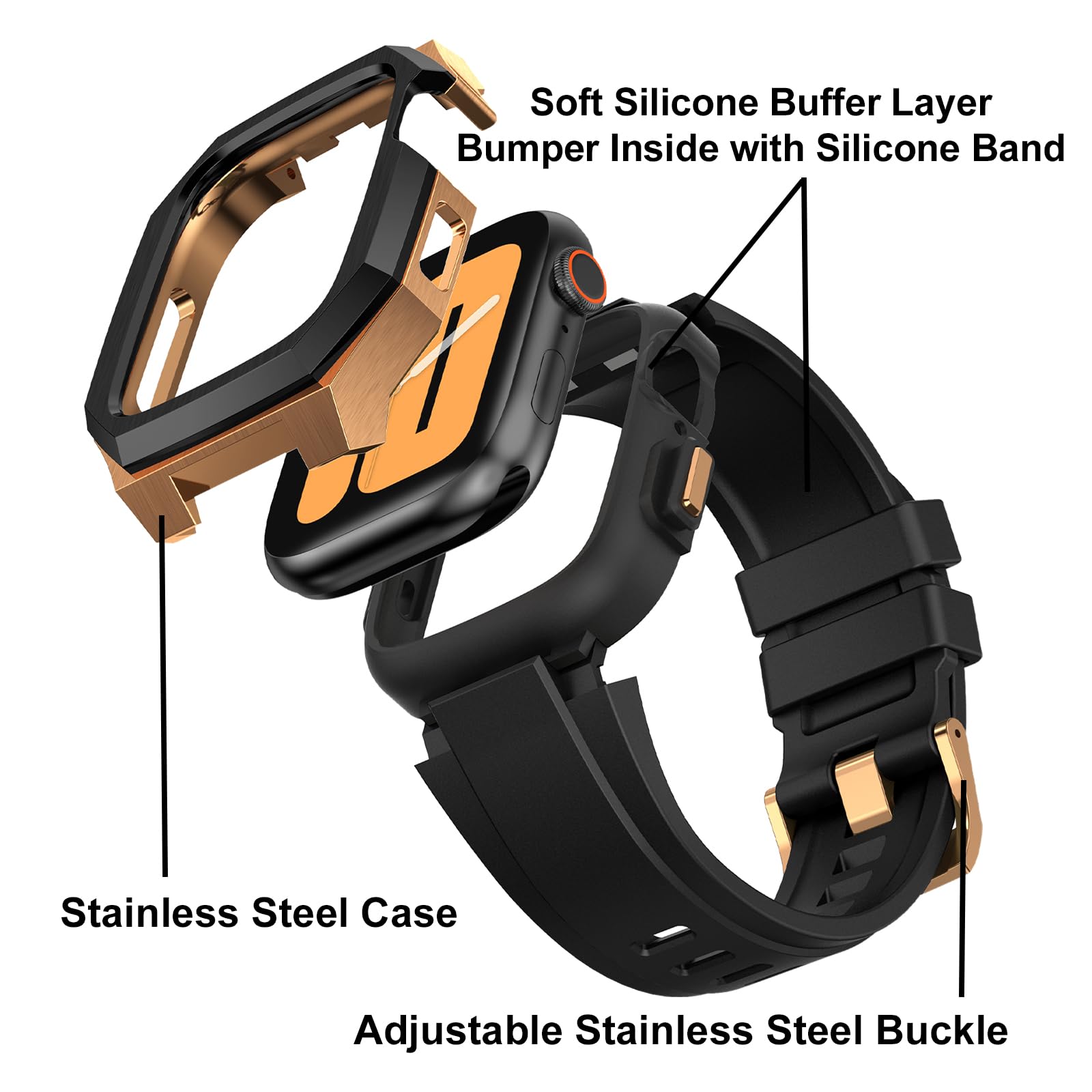 - 【All-Round Protection】Combining the premium stainless steel case with high elastic TPU buffer layer protects the watch screen from daily bumping and screen scratches.The stainless steel case is precisely cut according to the Watch. After installing the case. all watch functions. buttons and sensitivity can be accessed and easily operated.The band is made of high-quality silicone material. which is soft.light weight. breathable and waterproof.