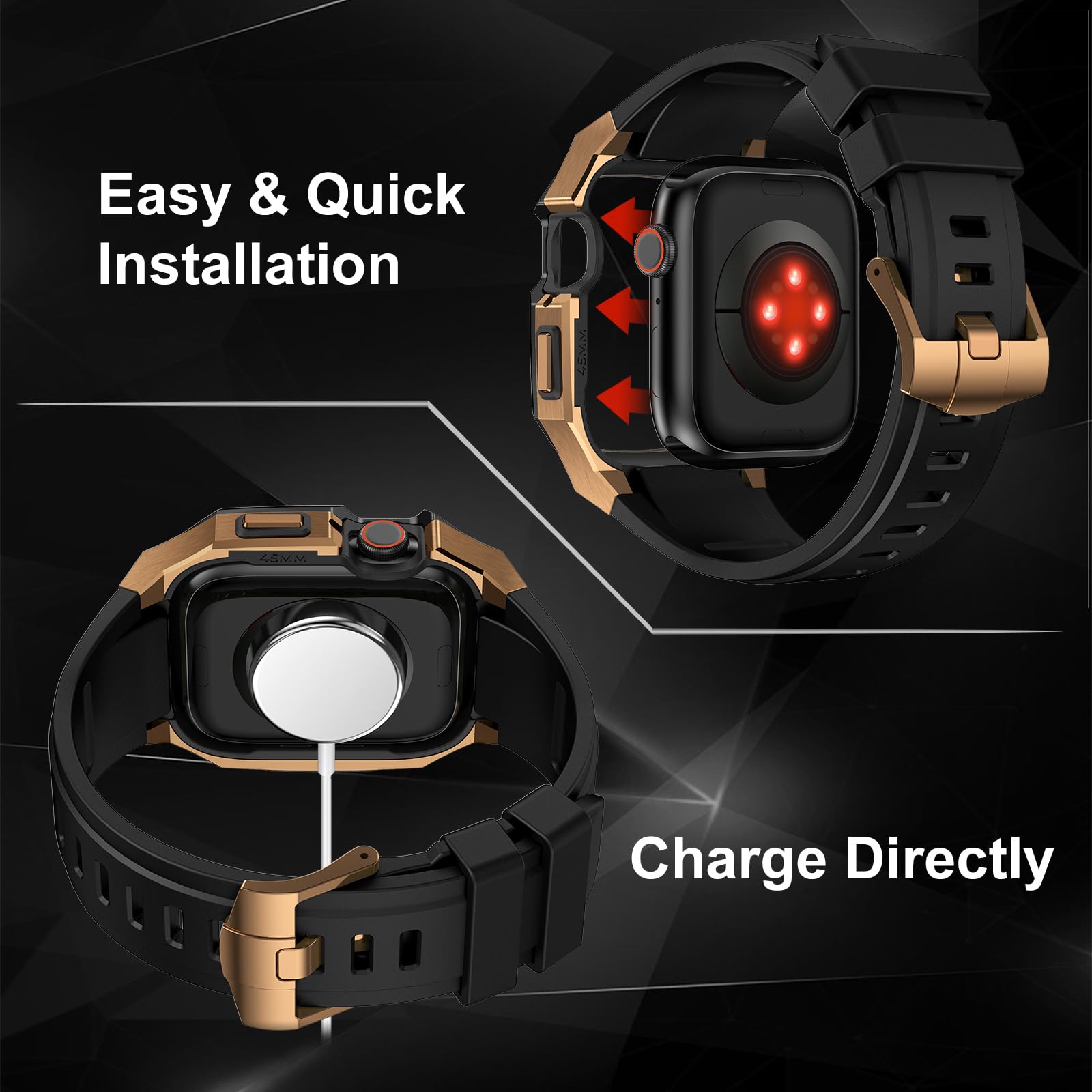 - 【Easy to Install & Remove】The one-piece case with iwatch band.Snap on make a quick and easy installation.no screws and any tool need.The inside case buffer layer made of soft TPU material.won't scratch your Apple Watch.The back of the band is hollowed out. which can be charged directly without removing the case bumper.