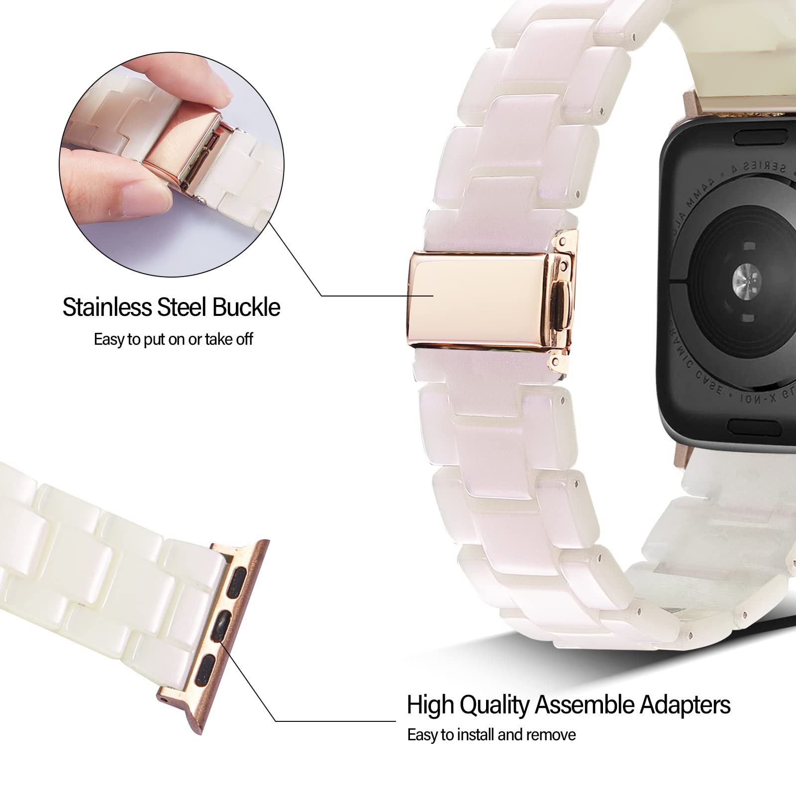 • 【So Easy to Wear and Adjust!】The refined folding clasp ensures the tortoise apple watch band is easy and quick to put on and take off at any time. A clear instruction and a resizing tool are included. After reading the instruction. you can quickly adjust the womens rose gold apple watch band to fit your wrist within seconds!