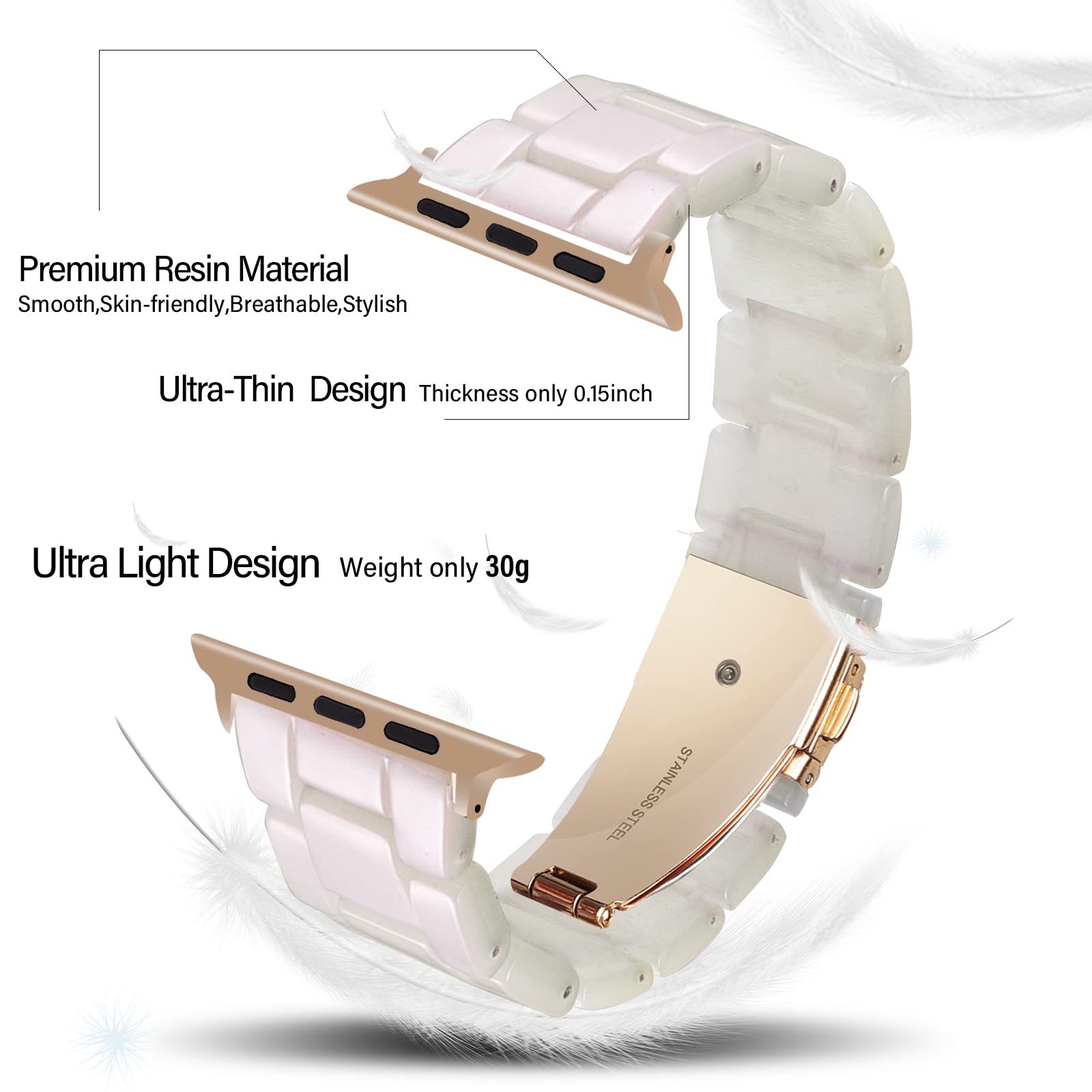 Crafted with unmatched attention to detail. our iWatch band boasts a smooth. skin-friendly surface. But it doesn't stop there; it's also delightfully light. outshining most women's bands in terms of weight.