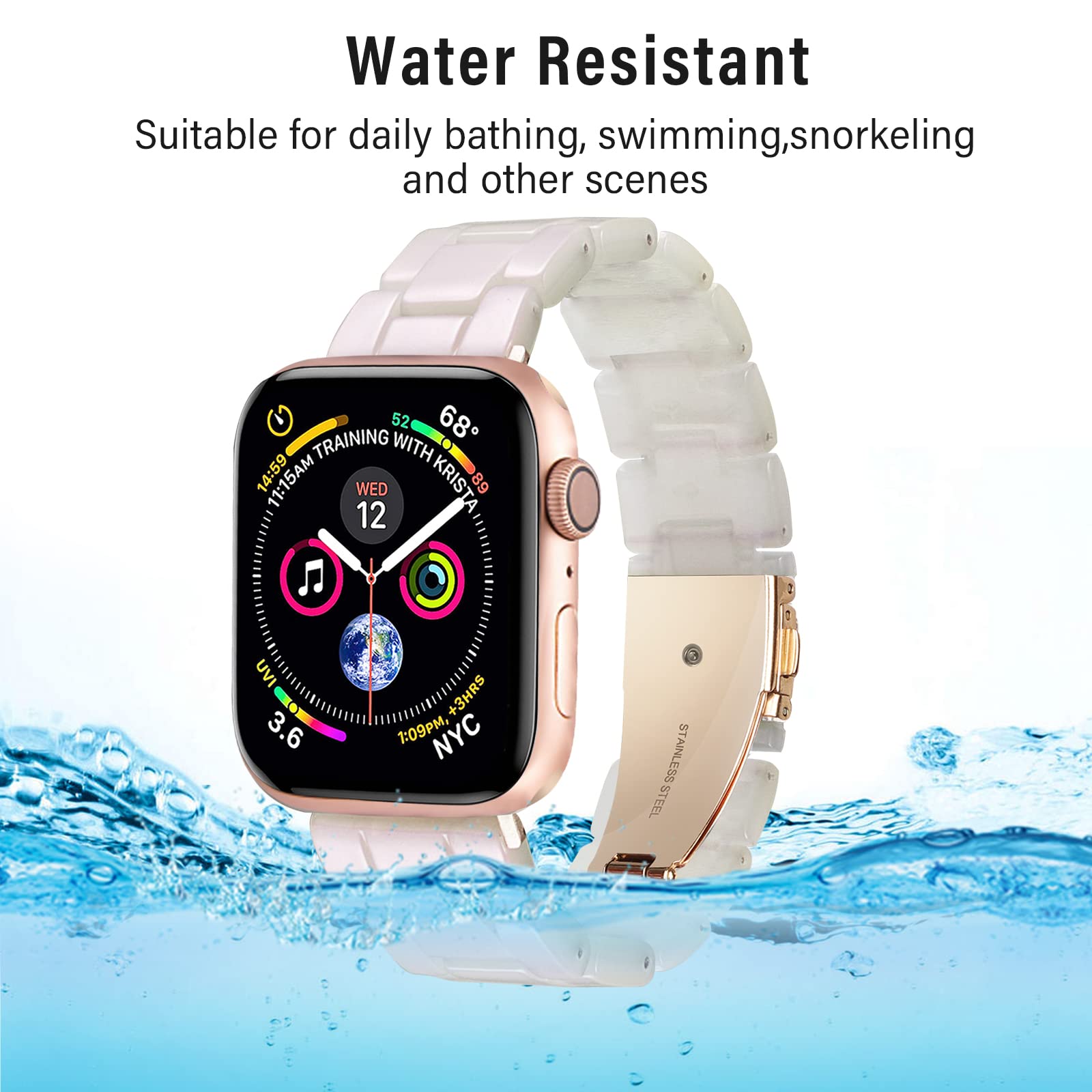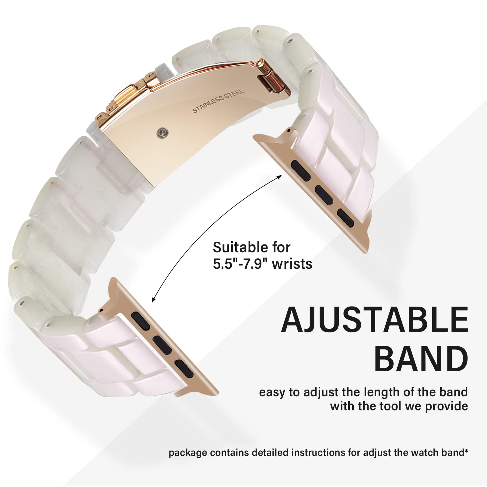 With a stainless-steel folding clasp. the apple watch band rose gold is easy enough to wear and double firmly closed. A link remover and a detailed instruction are involved for your most satisfactory using experience. Please read the instruction before resizing the band. Only seconds. double convenience!