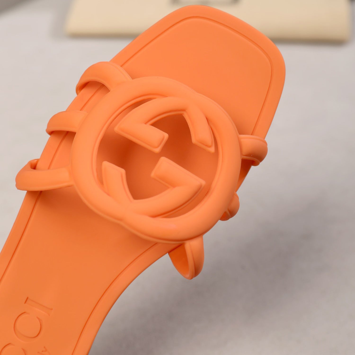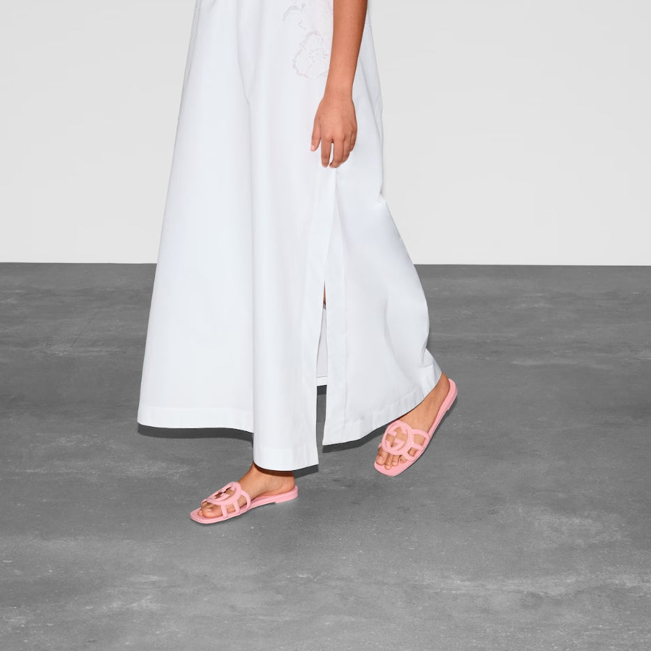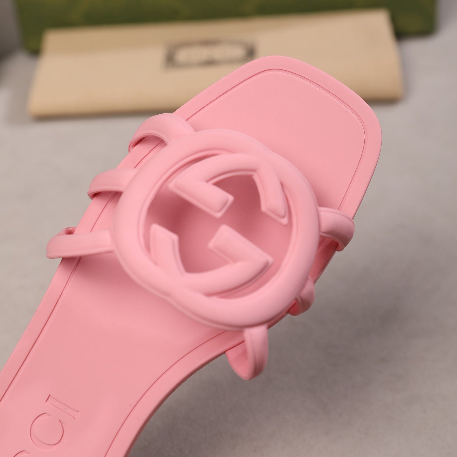 - This piece is inspired by summertime and beach clubs on the Italian coast. The Pre-Fall collection gives a modern twist to the brand's classic design elements and exquisite patterns. Crafted from pink rubber. these slides feature an interlocking G cutout detail that reflects the brand's logo.